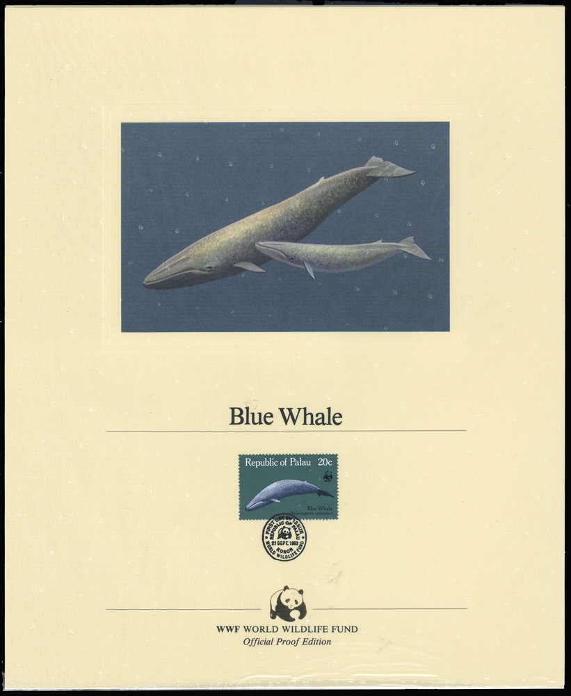 1983, 4 Werte Buckelwal, Blauwal, Finnwal und Pottwal als kompletter WWF Satz jeweils auf dekorativem und offiziellem WWF-Kunstdruck im USA Format 239x292 mm mit Tierbild von dem Künstler Richard Ellis/USA, zusätzlich auf dem Blatt den Namen des Tieres auf Englisch und passendem Ersttagsstempel sowie das offizielle Panda-Symbol im Goldprägedruck