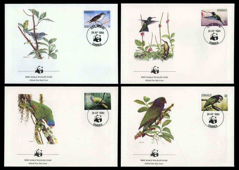 1984, 4 Werte Vögel aus Dominica jeweils auf attraktivem WWF Ersttagsbrief, mit Grauwaldsänger, Kaiseramazone, Zweifarbenkolibri und Blaukopfamazone, Auflage nur 102.000