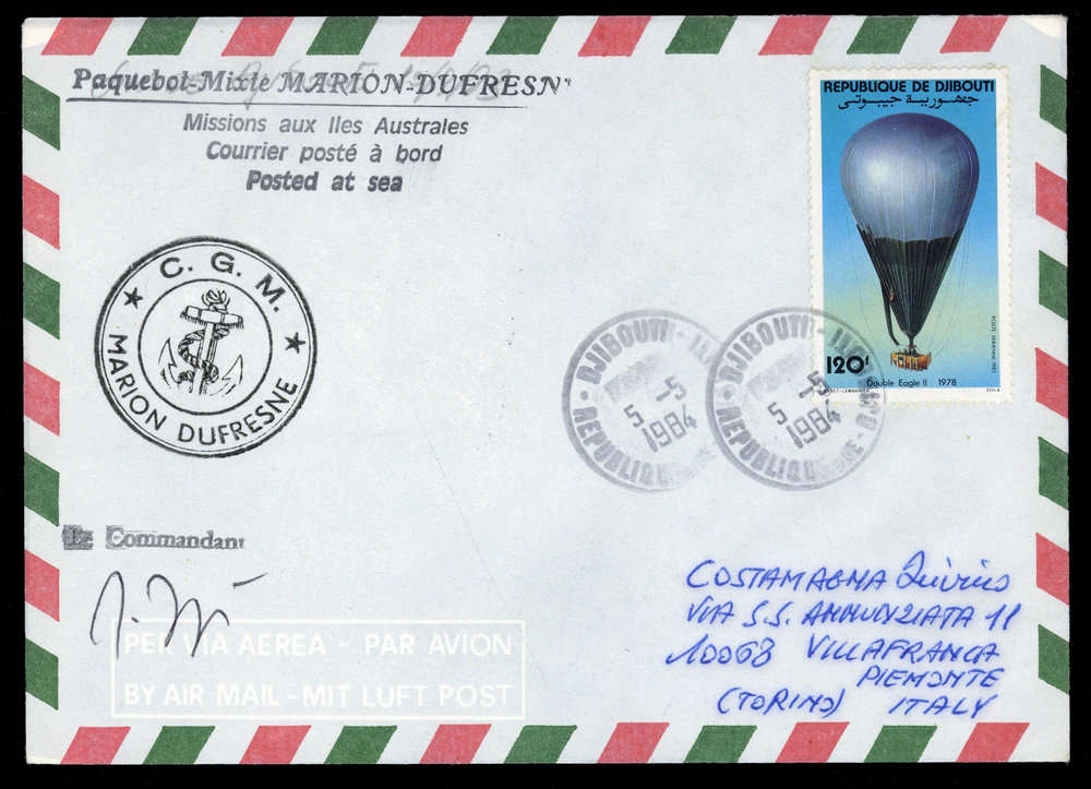 1984, 120 Fr. Ballon auf Brief mit "CGM Marion Dufresne" und L4 "Paquetbot Missions Iles Australes"
