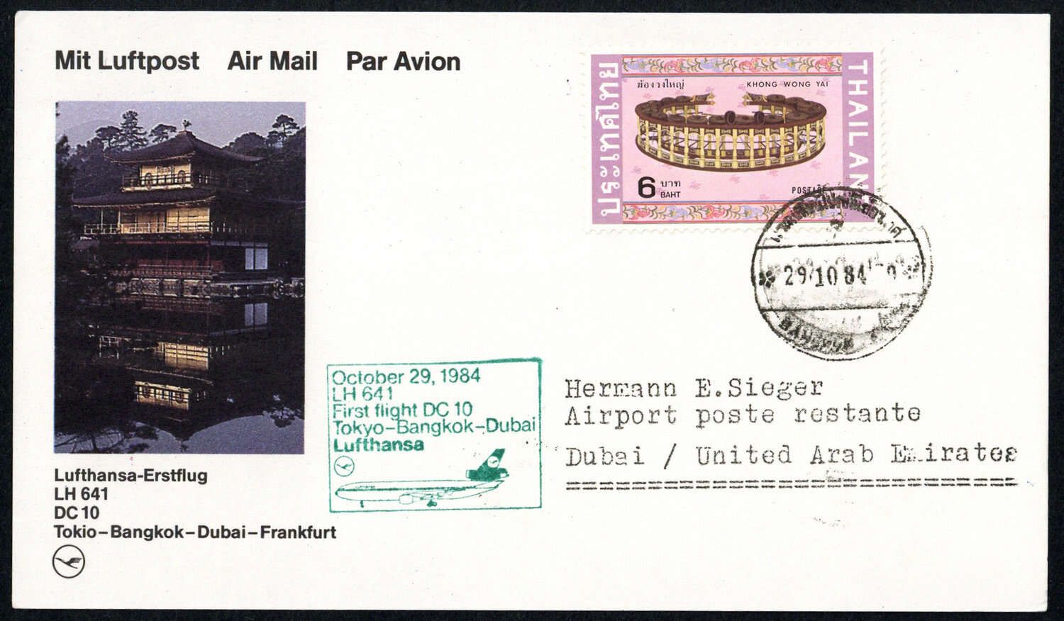 1984, Lufthansa-Erstflugkarte Bangkok-Dubai 29.10.84 mit 6 B. Khong Wong Yai