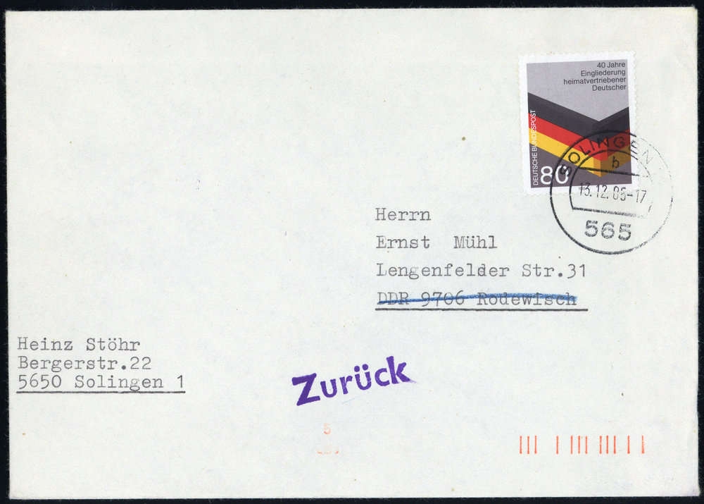 1985, 80 Pfg. Heimatvertriebene auf Brief von SOLINGEN 13.12.1985 nach Rodewisch / DDR, vorderseitig violetter Zurück-Einzeiler und rs. Vierzeiler "Von der Bestimmungspostverwaltung zurückgesandt", leichte Randspuren.