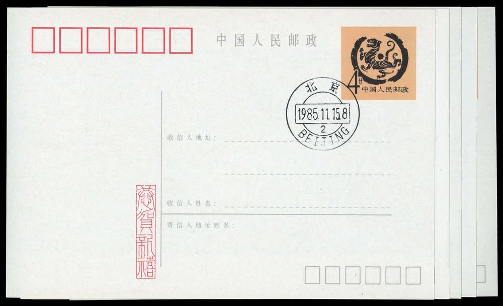 1985, 4 F Jahr des Tigers, 5 verschiedene GSK gest. "BEIJING 1985.11.15", nicht gelaufen