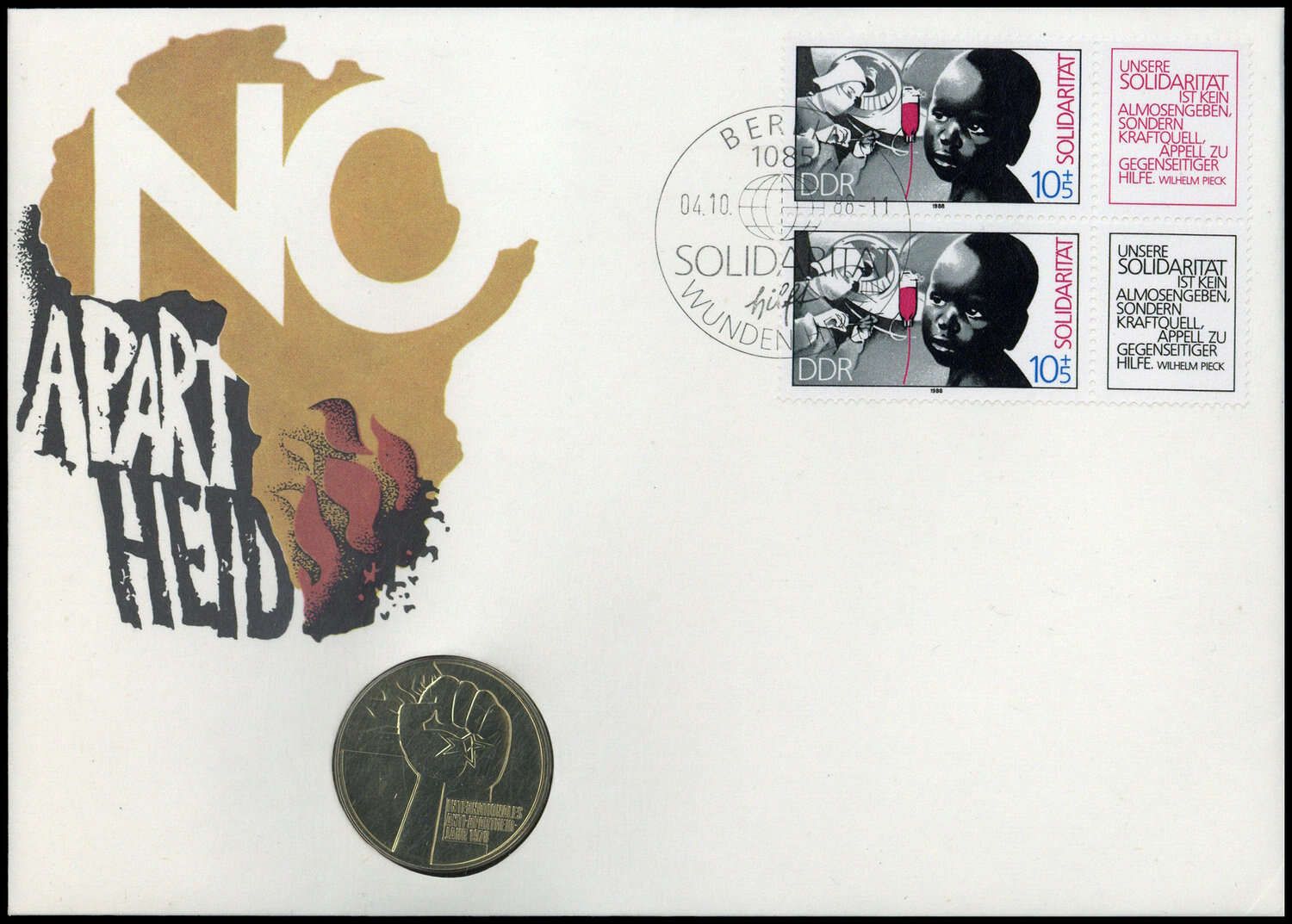 1985, Solidarität-Zusammendruckpaar auf Schmuckumschlag mit SST und 5 Mk. Anti Apartheid-Münze