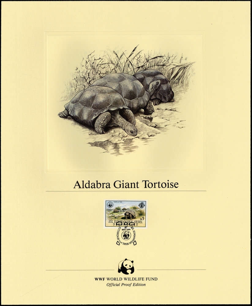 1985, 1 SR. Seychellen-Riesenschildkröte von den Seychellen als dekorativer und offizieller WWF-Kunstdruck im USA Format 239x292 mm mit Tierbild von dem Künstler John Schoenherr/USA, zusätzlich auf dem Blatt den Namen des Tieres auf Englisch und passendem Ersttagsstempel sowie das offizielle Panda-Symbol im Goldprägedruck