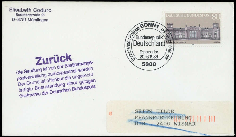 1986, 80 Pfg. Reichstagsgebäude auf FDC mit ESST "BONN 20.6.1986", adressiert in die DDR, violetter Mehrzeiler "Zurück. / Die Sendung ist von der Bestimmungspostverwaltung zurückgesandt worden ...".