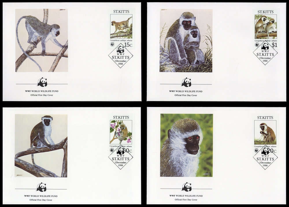 1986, 4 Werte Grüne Meerkatze aus St. Christopher St. Kitts jeweils auf attraktivem WWF Ersttagsbrief, Auflage nur 58.000