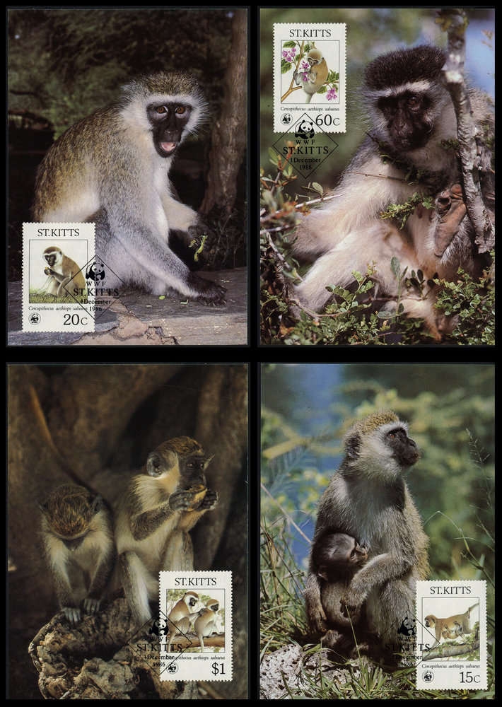 1986, 4 Werte Grüne Meerkatze aus St. Christopher St. Kitts jeweils auf attraktiver WWF Maximumkarte, Auflage nur 58.000
