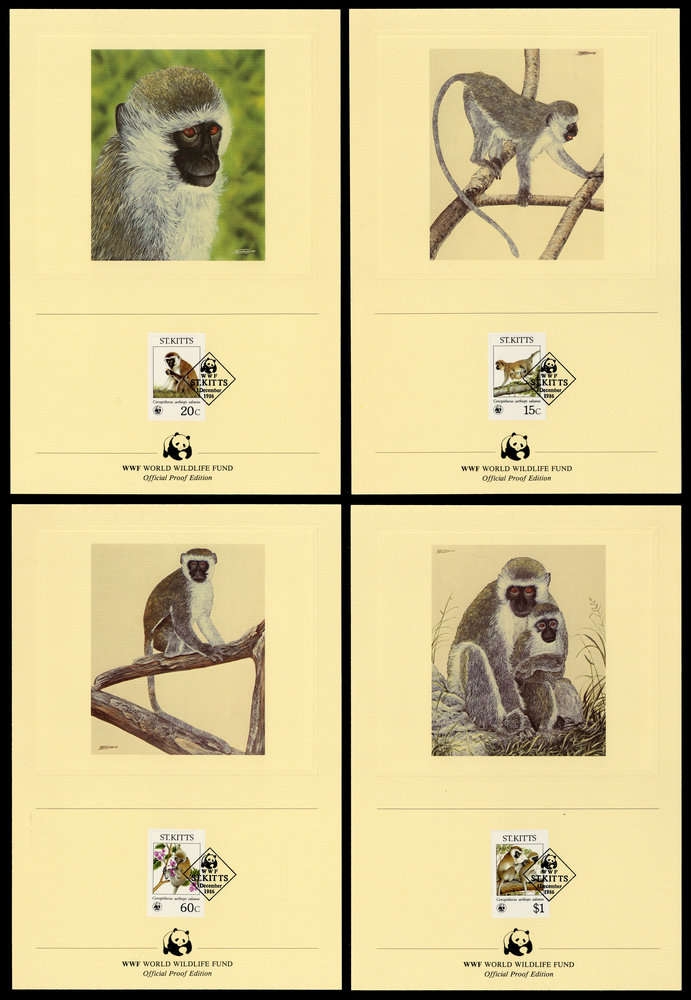 1986, 4 Werte Grüne Meerkatze von St. Kitts & Nevis als kompletter WWF Satz jeweils auf dekorativem und offiziellem WWF-Kunstdruck im EU Format 180x265 mm mit Tierbild von dem Künstler Fred Szatkowski/USA und passendem Ersttagsstempel sowie das offizielle Panda-Symbol im Goldprägedruck