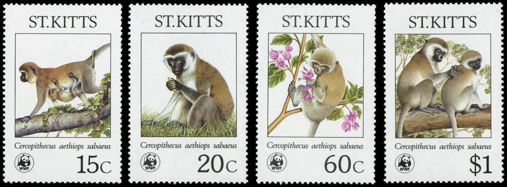 1986, 4 Werte Grüne Meerkatze aus St. Kitts als kompletter postfrischer WWF Satz, Auflage nur 58.000