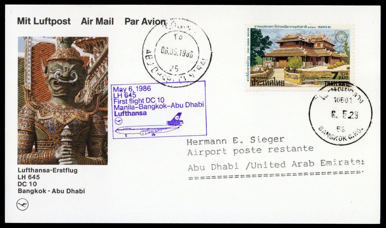1986, Lufthansa-Erstflugkarte Bangkok-Abu Dhabi 5.5.86 mit 7 B. Thaipex