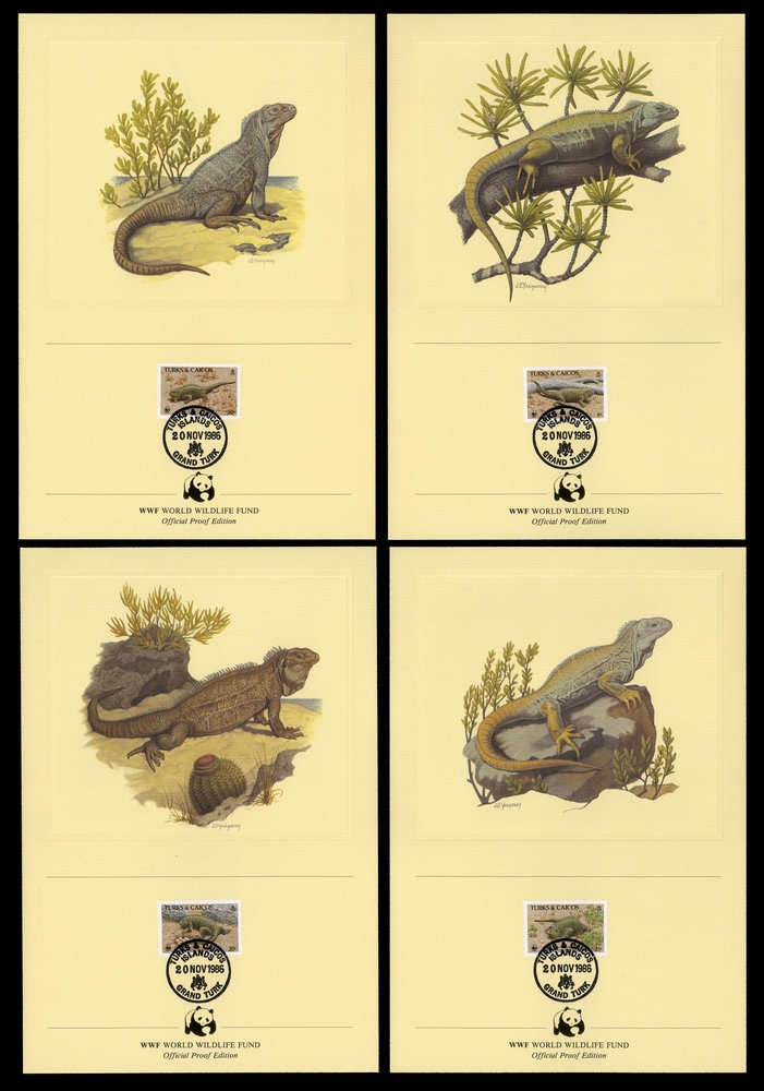 1986, 4 Werte Turks-und-Caicos-Leguan von den Turks- und Caicos-Inseln als kompletter WWF Satz jeweils auf dekorativem und offiziellem WWF-Kunstdruck im EU Format 180x265 mm mit Tierbild von dem Künstler John C. Yrizarry/USA und passendem Ersttagsstempel sowie das offizielle Panda-Symbol im Goldprägedruck