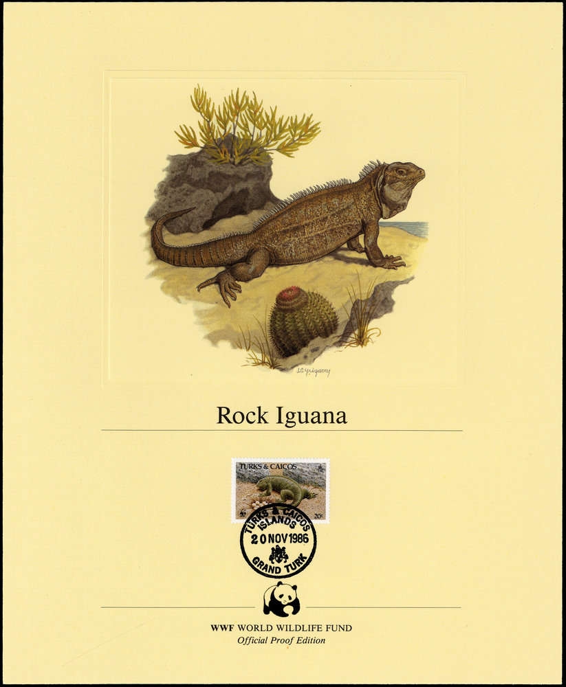 1986, 20 C. Turks-und-Caicos-Leguan von den Turks- & Caicos-Inseln als dekorativer und offizieller WWF-Kunstdruck im USA Format 239x292 mm mit Tierbild von dem Künstler John C. Yrizarry/USA, zusätzlich auf dem Blatt den Namen des Tieres auf Englisch und passendem Ersttagsstempel sowie das offizielle Panda-Symbol im Goldprägedruck