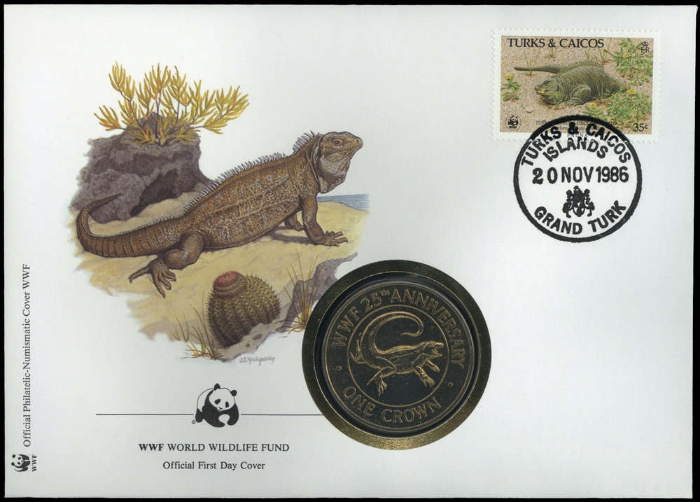 1986, 35 C. Wirtelschwanzleguan von den Turks- & Caicos Inseln auf dekorativem und offiziellem WWF-Numisbrief mit passendem Ersttagsstempel und der WWF Sondermünze "25th Anniversary"