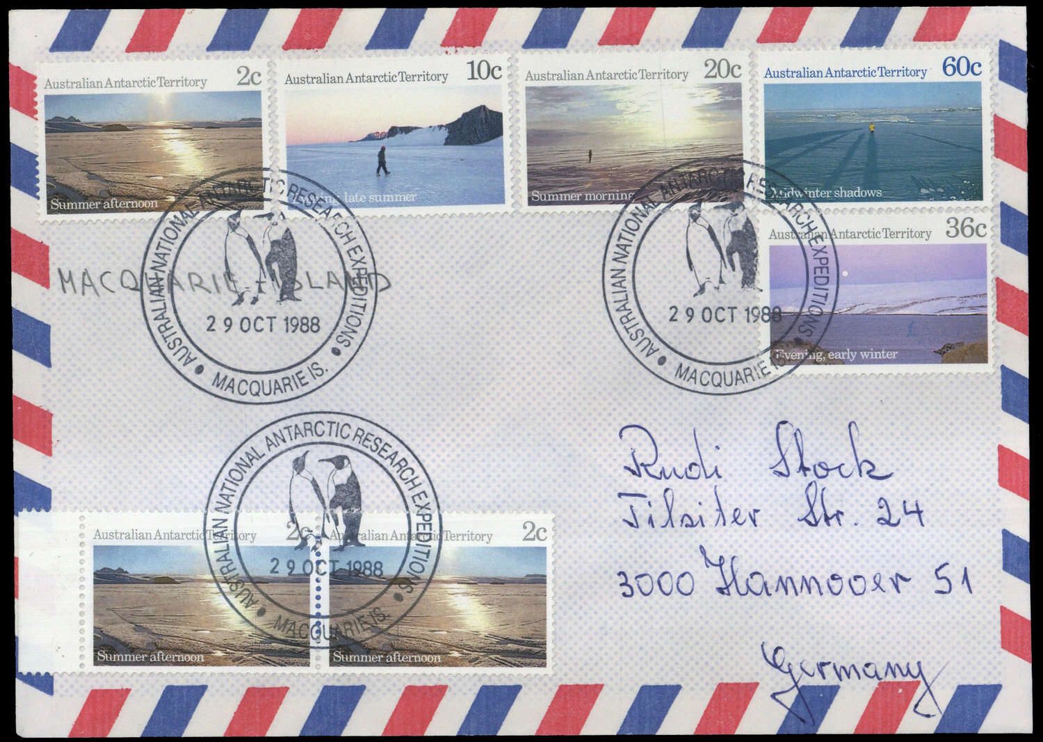 1987, 2 (3) und 10-60 C Landschaften, SST "MACQUARIE IS. A.N.A.R.E. 29 OCT 1988", Luftpostbrief, Beförderungsspuren, nach Hannover