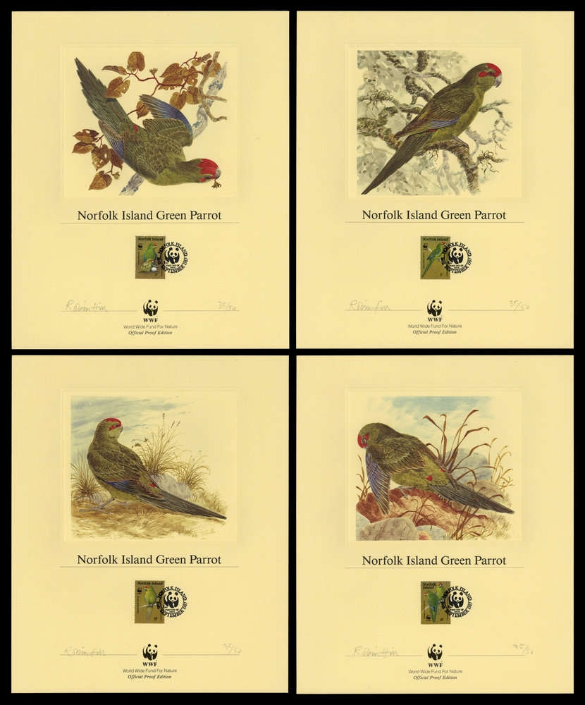 1987, 4 Werte Laufsittich von den Norfolk-Inseln als kompletter WWF Satz jeweils auf dekorativem und offiziellem WWF-Kunstdruck im USA Format 239x292 mm mit Tierbild und Originalunterschrift von dem Künstler Robin Hill/USA, zusätzlich auf dem Blatt den Namen des Tieres und passendem Ersttagsstempel sowie das offizielle Panda-Symbol im Goldprägedruck. Nummerierte Spezialauflage mit einer Weltauflage von nur 50 Stück!