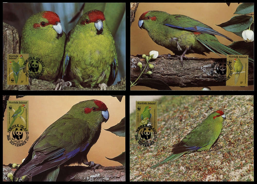 1987, 4 Werte Laufsittich von der Norfolk-Inseln jeweils auf attraktiver WWF Maximumkarte