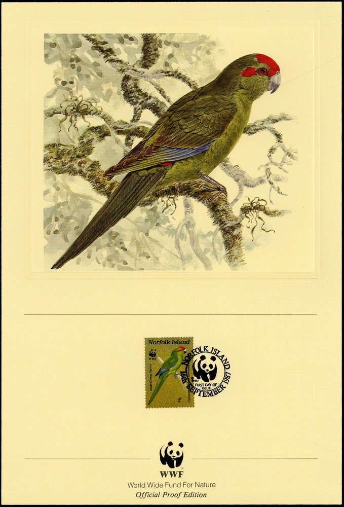 1987, 5 C. Laufsittich von den Norfolk-Inseln als dekorativer und offizieller WWF-Kunstdruck im EU Format 180x265 mm mit Tierbild von dem Künstler Robin Hill/USA und passendem Ersttagsstempel sowie das offizielle Panda-Symbol im Goldprägedruck