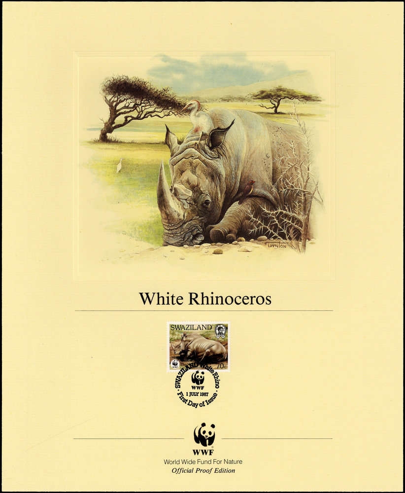 1987, 70 C. Breitmaulnashorn aus Swaziland als dekorativer und offizieller WWF-Kunstdruck im USA Format 239x292 mm mit Tierbild von der Künstlerin Patricia Taynton/USA, zusätzlich auf dem Blatt den Namen des Tieres auf Englisch und passendem Ersttagsstempel sowie das offizielle Panda-Symbol im Goldprägedruck