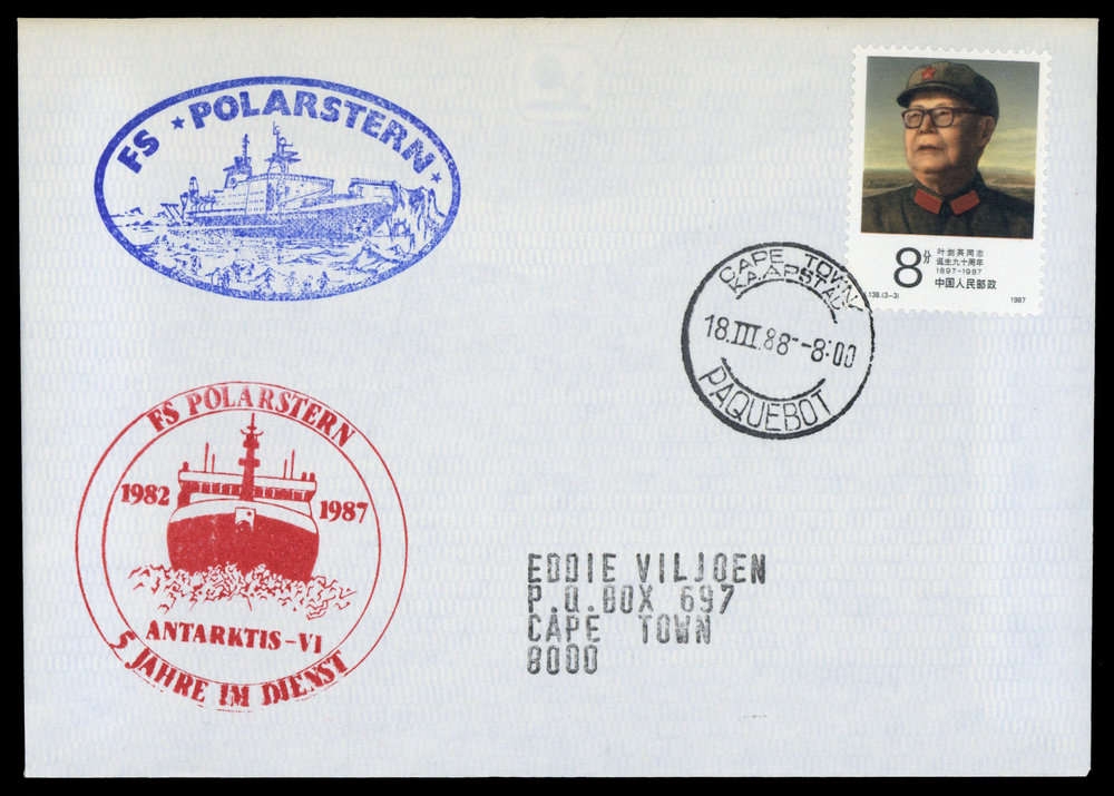 1988, "CAPE TOWN/KAAPSTAD 18 III 88/PAQUEBOT", auf 8 F Ye Jianying, auf Sonderumschlag mit "FS POLARSTERN": Oval/blau und K2 "ANTARKTIS VI"/rot