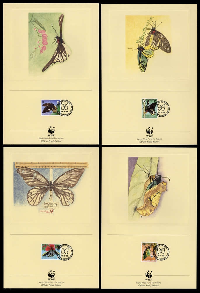 1988, 4 Werte Queen-Alexandra-Vogelfalter aus Papua-Neuguinea als kompletter WWF Satz jeweils auf dekorativem und offiziellem WWF-Kunstdruck im EU Format 180x265 mm mit Tierbild von dem Künstler Michael Parsons/USA und passendem Ersttagsstempel sowie das offizielle Panda-Symbol im Goldprägedruck