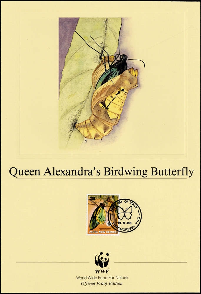 1988, 25 T. Queen-Alexandra-Vogelfalter aus Papua-Neuguinea als dekorativer und offizieller WWF-Kunstdruck im EU Format 180x265 mm mit Tierbild von dem Künstler Michael Parsons/USA, zusätzlich auf dem Blatt den Namen des Tieres auf Englisch und passendem Ersttagsstempel sowie das offizielle Panda-Symbol im Goldprägedruck