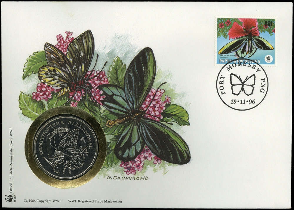 1988, 35 T. Queen-Alexandra-Vogelfalter aus Papua Neuguinea auf dekorativem und offiziellem WWF-Numisbrief mit passendem WWF Sonderstempel von 1996 und der WWF Sondermünze "Queen-Alexandra-Vogelfalter - Ornithoptera alexandrae"