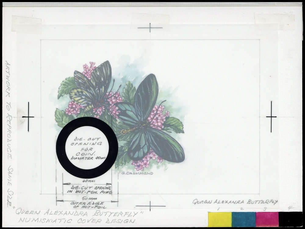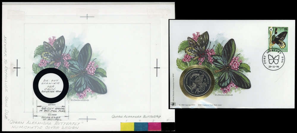 1988, Original von Hand gemaltes Kunstwerk "Queen-Alexandra-Vogelfalter" in Farbe für den offiziellen WWF Numisbrief "Queen-Alexandra-Vogelfalter" (Ornithoptera alexandrae) aus Papua Neuguinea auf Karton in der Gesamtgröße 242x178 mm von dem Künstler Gordon Drummond/Großbritannien