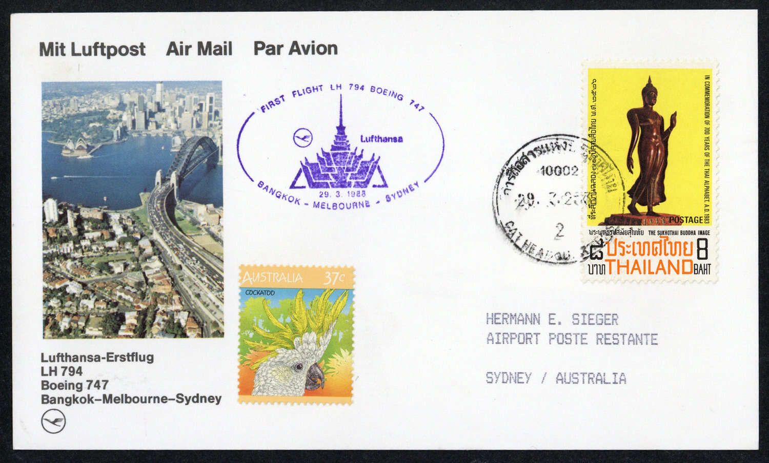 1988, Lufthansa-Erstflugkarte Bangkok-Sydney 29.3.88 mit zwei Werten