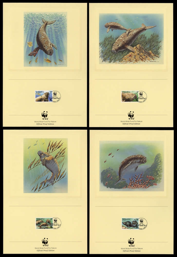 1988, 4 Werte Dugong aus Vanuatu als kompletter WWF Satz jeweils auf dekorativem und offiziellem WWF-Kunstdruck im EU Format 180x265 mm mit Tierbild von dem Künstler George Luther Schelling/USA und passendem Ersttagsstempel sowie das offizielle Panda-Symbol im Goldprägedruck