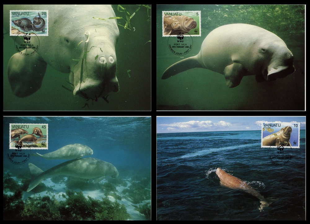 1988, 4 Werte Dugong aus Vanuatu jeweils auf attraktiver WWF Maximumkarte, Auflage nur 175.000