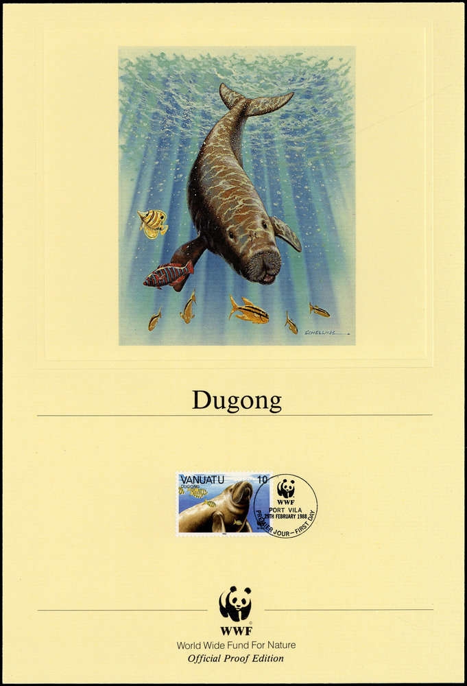 1988, 10 VT. Dugong aus Vanuatu als dekorativer und offizieller WWF-Kunstdruck im EU Format 180x265 mm mit Tierbild von dem Künstler George Luther Schelling/USA, zusätzlich auf dem Blatt den Namen des Tieres auf Englisch und passendem Ersttagsstempel sowie das offizielle Panda-Symbol im Goldprägedruck