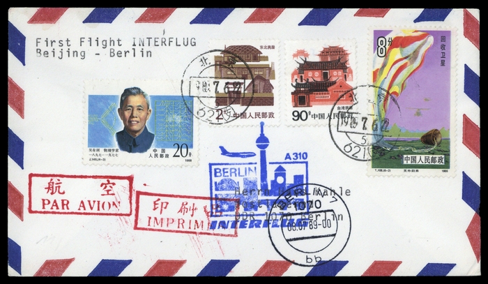1989, "INTERFLUG A 310 First Flight Peking-Berlin 6.7.1989" auf Brief mit 4 Marken nach Berlin, Ak-Stempel, rote Flugpost-und Drucksachenstempel