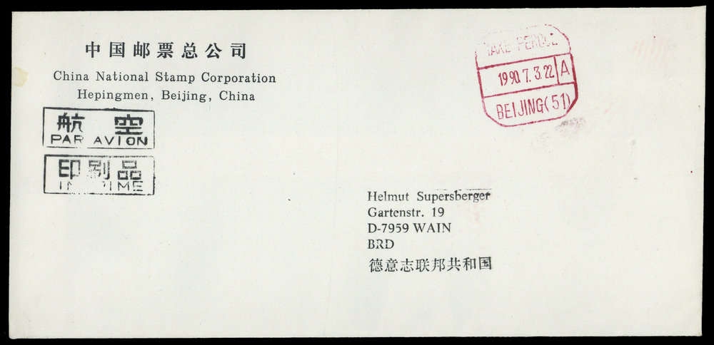1990, "TAXE PERCUE 1990.7.3.33-A BEIJING (51)", roter Achteck-Ra3, Firmen-Luftpostbrief, im Rand Nadellochung, nach Wain/D