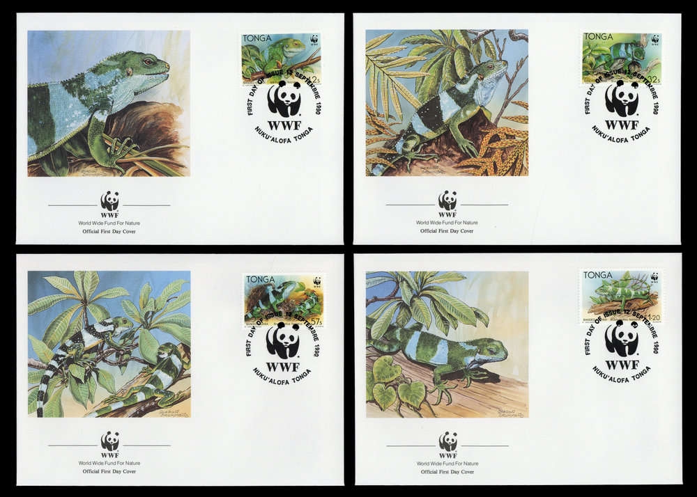 1990, 4 Werte Kurzkammleguan aus Tonga jeweils auf attraktivem WWF Ersttagsbrief, Auflage nur 120.000