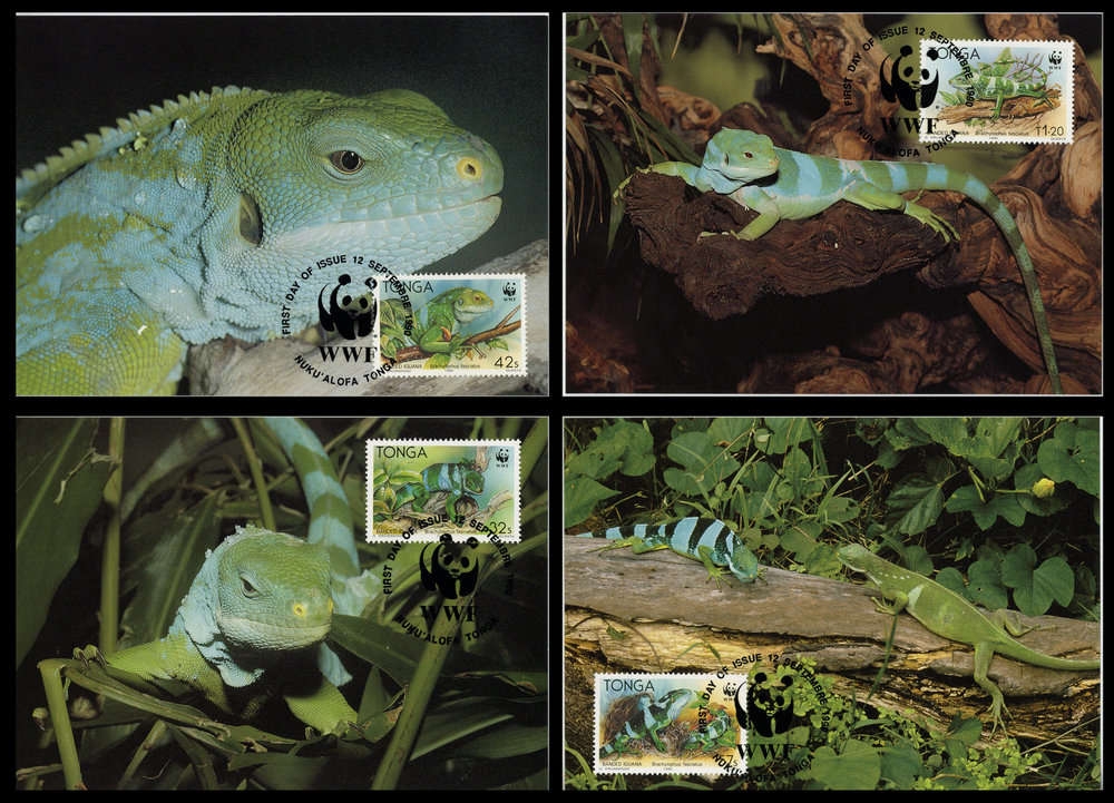 1990, 4 Werte Kurzkammleguan aus Tonga jeweils auf attraktiver WWF Maximumkarte, Auflage nur 120.000