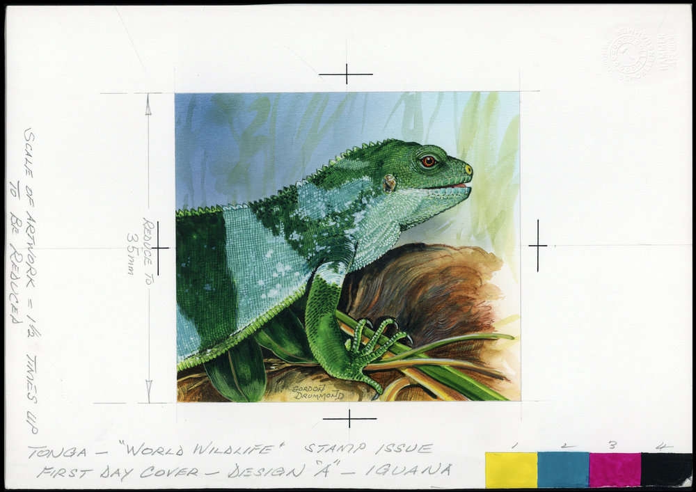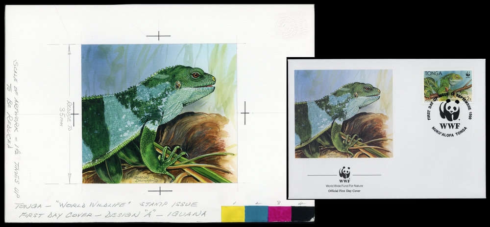 1990, Original von Hand gemaltes Kunstwerk "Kurzkammleguan" in Farbe für den offiziellen WWF Ersttagsbriefumschlag "Kurzkammleguan" (Brachylophus fasciatus) aus Tonga mit der Wertstufe zu 42 S. auf Karton in der Gesamtgröße 253x177 mm von dem Künstler Gordon Drummond/Großbritannien, der auch die Originalmarken der WWF Ausgabe entworfen hat!