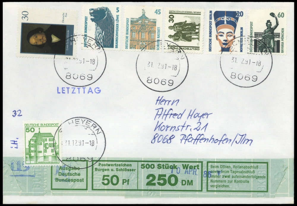 1991, 50 Pfg. Burgen & Schlösser mit vorder- und rückseitig verklebter Banderole (500 Stück Wert 250 DM) mit Zusatzfrankatur (Bund + Berlin + DDR Dt. Post) zusammen auf Brief von SCHEYERN 31.12.91 nach Pfaffenhofen, oben etwas verkürzt.