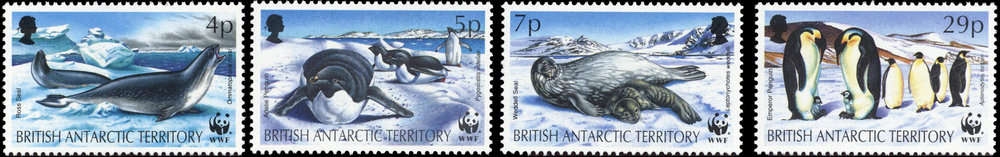 1992, 4 Werte Tiere von den Britischen Gebieten in der Antarktis als kompletter postfrischer WWF Satz mit Ross-Robbe, Adeliepinguin, Weddell-Robbe und Kaiserpinguin, Auflage nur 135.000