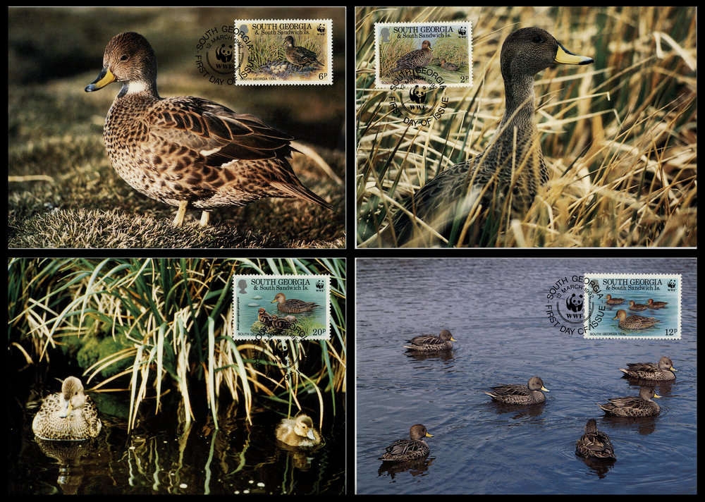 1992, 4 Werte Südgeorgische Spießente aus Süd-Georgien jeweils auf attraktiver WWF Maximumkarte, Auflage nur 128.000