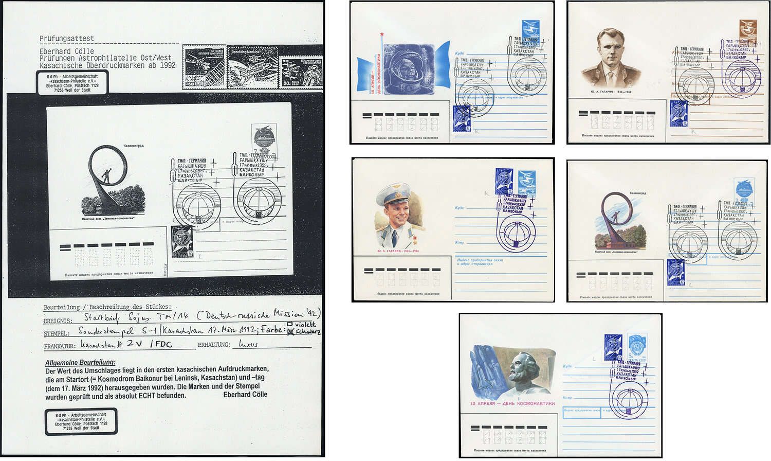1992, 11 Ersttagsbrief- Garnituren mit den ersten beiden Marken von Kasachstan jeweils einzeln in der Erstauflage. Es gibt Ersttagsbriefe mit dem violetten Sonderstempel, schwarzen Sonderstempel aber auch mit violett und schwarz gleichzeitig! Alle kompetent geprüft "Echt Cölle" - Spezialist der Kasachstan Philatelie/Weil der Stadt. Im Michel 2020 fehlt eine Bewertung für Ersttagsbriefe, da die Auflagezahl extrem gering war!