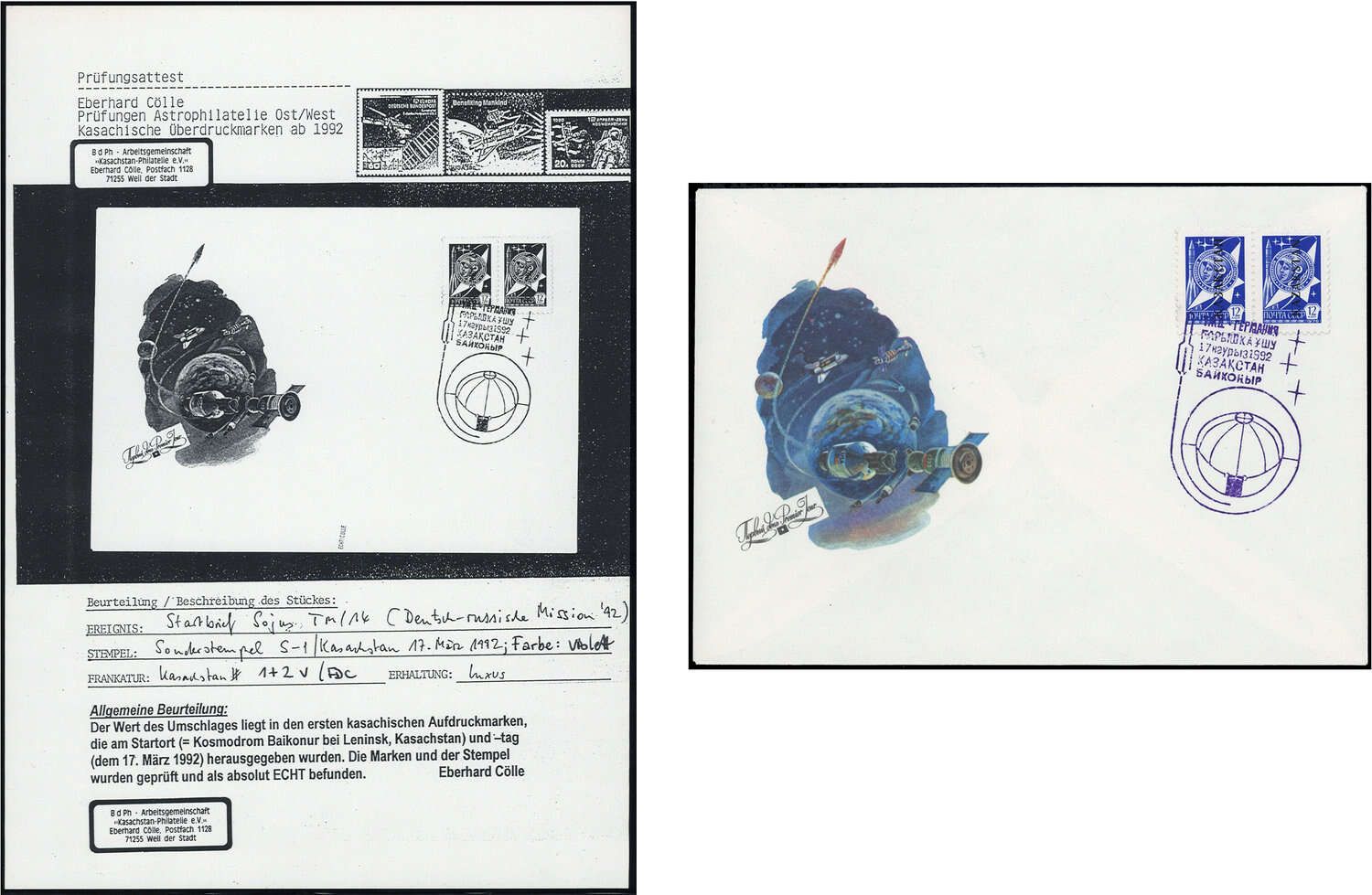 1992, 13 Ersttagsbriefe mit den ersten beiden Marken von Kasachstan jeweils im Paar in der Erstauflage. Alle Ersttagsbriefe sind mit dem violetten Sonderstempel entwertet sowie kompetent geprüft "Echt Cölle" - Spezialist der Kasachstan Philatelie/Weil der Stadt. Im Michel 2020 fehlt eine Bewertung für Ersttagsbriefe, da die Auflagezahl extrem gering war!
