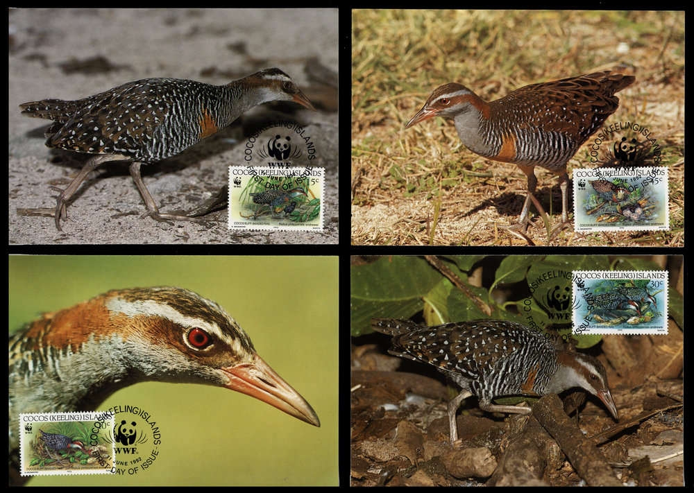 1992, 4 Werte Vögel von den Kokos Inseln jeweils auf attraktiver WWF Maximumkarte mit Keeling-Bindenralle, Auflage nur 135.000