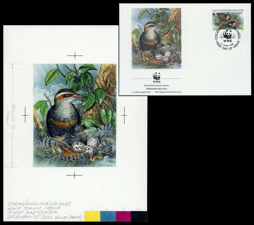 1992, Original von Hand gemaltes Kunstwerk "Keeling-Bindenralle" in Farbe für den offiziellen WWF Ersttagsbriefumschlag "Keeling-Bindenralle" (Rallus philippensis andrewsi) von den Kokos-Inseln mit der Wertstufe zu 45 C. auf Karton in der Gesamtgröße 177x242 mm von dem Künstler Gordon Drummond/Großbritannien, der auch die Originalmarken der WWF Ausgabe entworfen hat!