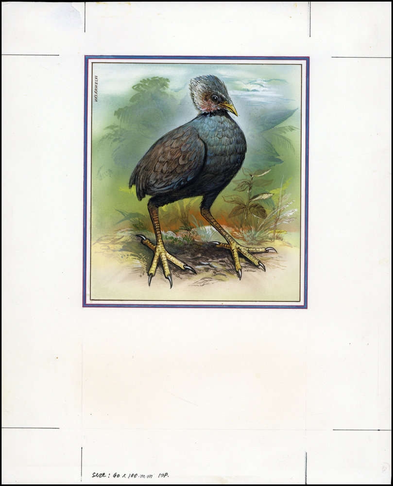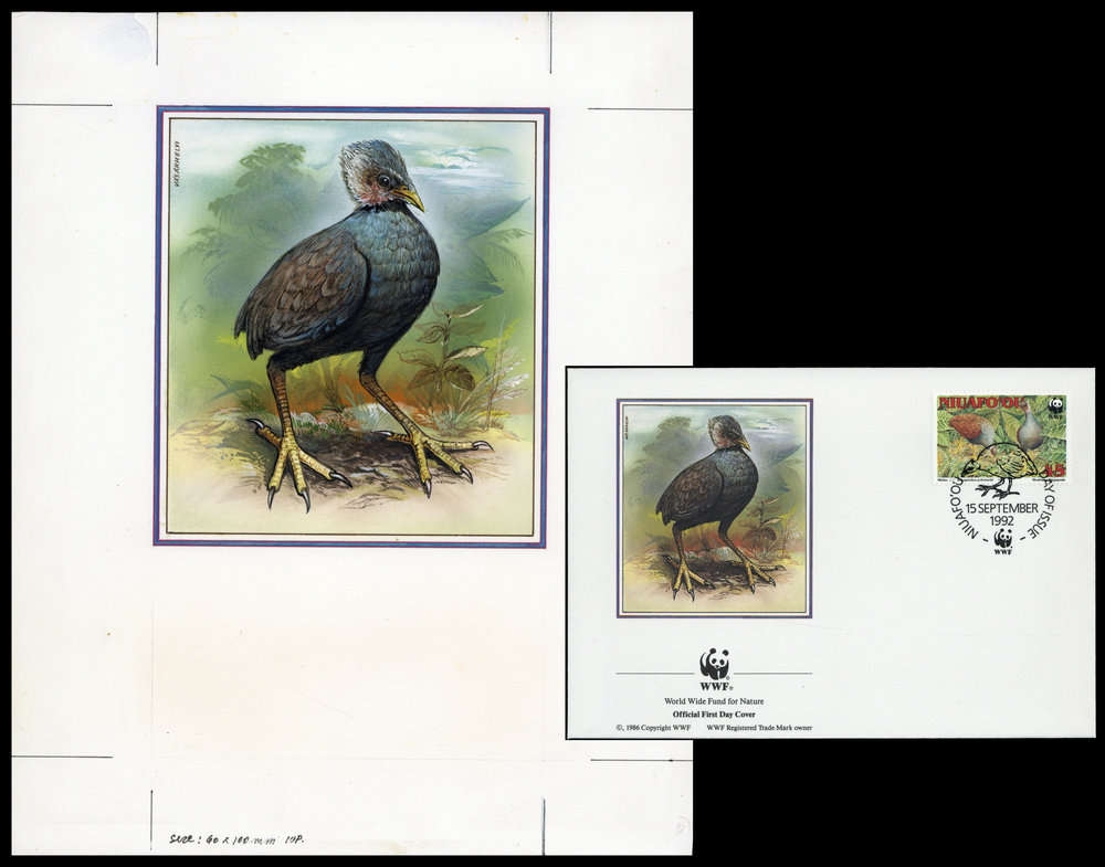 1992, Original von Hand gemaltes Kunstwerk "Niuafo'ou-Grossfusshuhn" in Farbe für den offiziellen WWF Ersttagsbriefumschlag "Niuafo'ou-Grossfusshuhn" (Megapodius pritchardii) von den Niuafoou Inseln mit der Wertstufe zu 45 S. auf Kartonpapier in der Gesamtgröße 210x260 mm von dem Künstler Gyula Laszlo Vasarhelyi/Großbritannien.