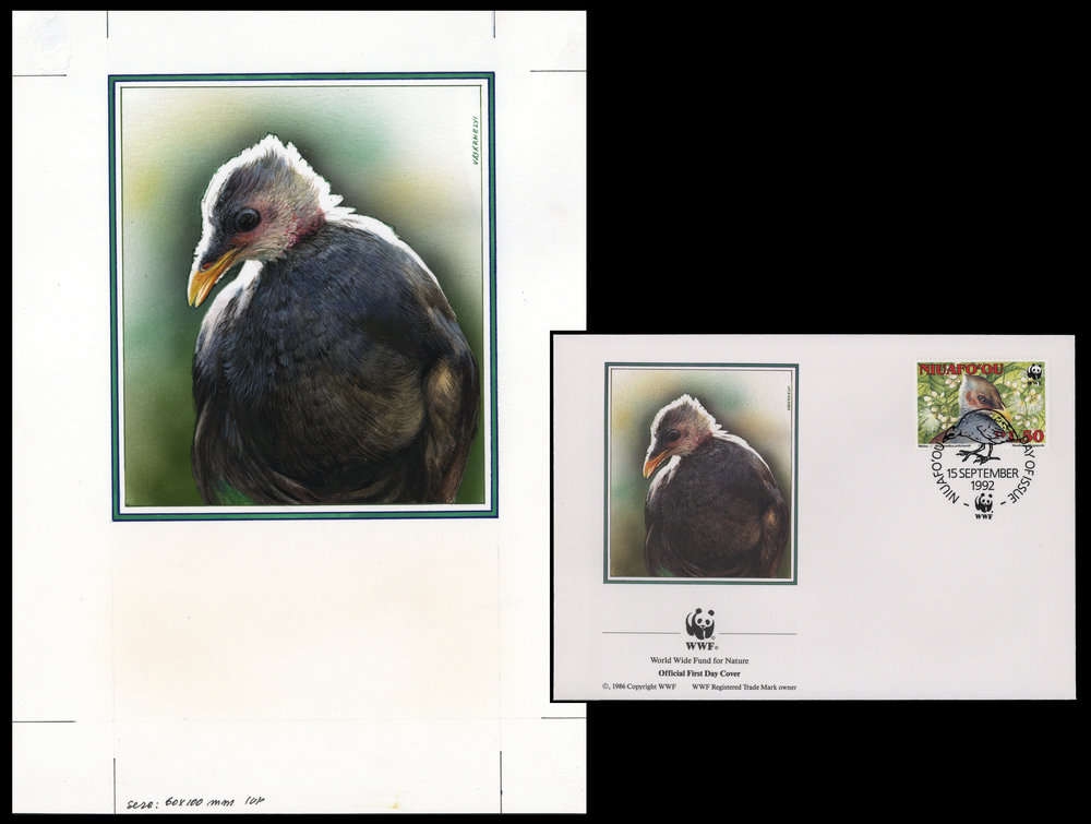 1992, Original von Hand gemaltes Kunstwerk "Niuafo'ou-Grossfusshuhn" in Farbe für den offiziellen WWF Ersttagsbriefumschlag "Niuafo'ou-Grossfusshuhn" (Megapodius pritchardii) von den Niuafoou Inseln mit der Wertstufe zu 1,50 T$ auf Kartonpapier in der Gesamtgröße 210x258 mm von dem Künstler Gyula Laszlo Vasarhelyi/Großbritannien.