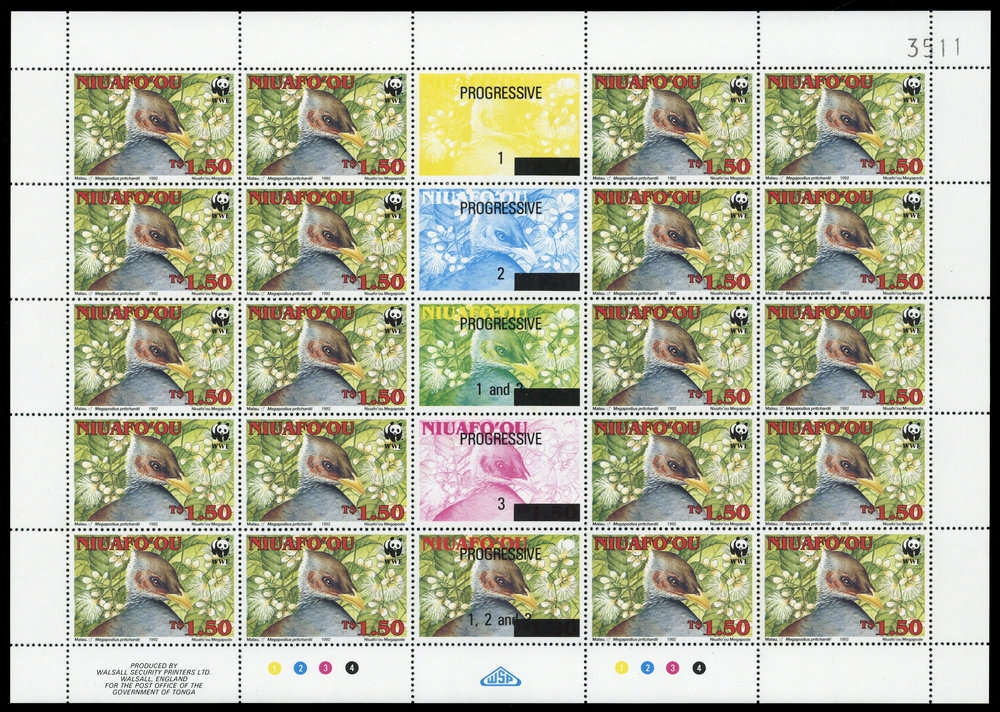 1992, 1.50 Dollar WWF "Pritchard-Dschungelhuhn" als postfrischer Druckbogen mit 20 Marken und einem senkrechten 5-er Streifen in der Mitte mit 5 Probedrucken, bei dem verschiedene Druckphasen aufgezeigt werden