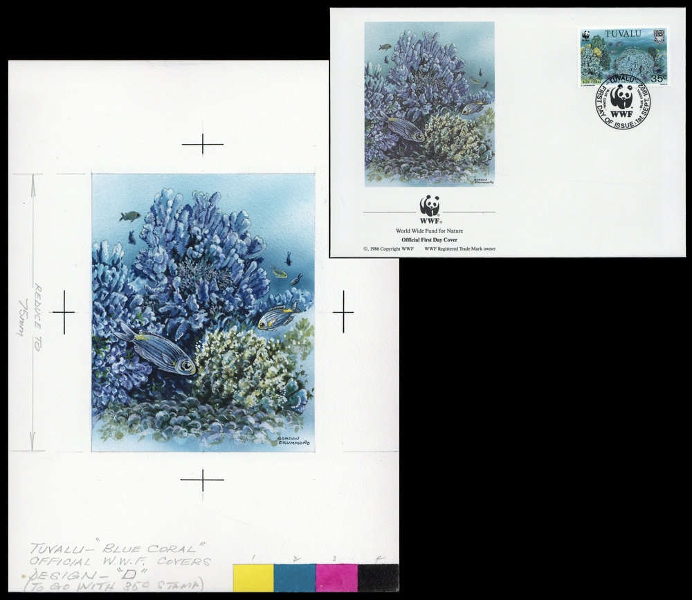 1992, Original von Hand gemaltes Kunstwerk "Blaukoralle" in Farbe für den offiziellen WWF Ersttagsbriefumschlag "Blaukoralle" (Heliopora coerulea) aus Tuvalu mit der Wertstufe zu 35 C. auf Karton in der Gesamtgröße 178x242 mm von dem Künstler Gordon Drummond/Großbritannien, der auch die Originalmarken der WWF Ausgabe entworfen hat!