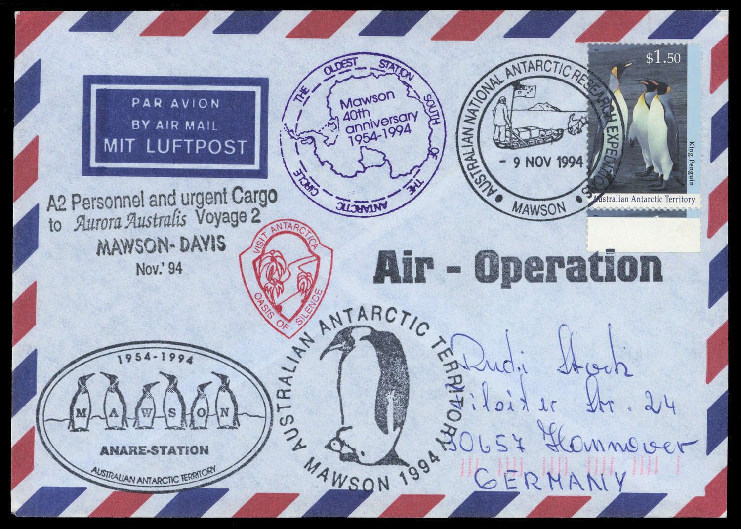 1993, 1.50 Dollar Königspinguine, Luftpostbrief mit Stations-K2 "MAWSON A.N.A.R.E. 9 NOV 1994", 5 weitere Nebenstempel, Beförderungspuren nach Hannover