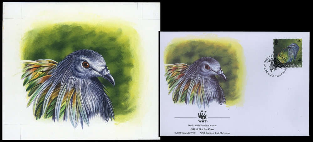 1993, Original von Hand gemaltes Kunstwerk "Kragentaube" in Farbe für den offiziellen WWF Ersttagsbriefumschlag "Kragentaube" (Coloenas nicobarica) von den Salomoninseln mit der Wertstufe zu 30 C. auf Karton in der Gesamtgröße 171x150 mm von dem Künstler Andrew Robinson/Großbritannien, der auch die Originalmarken der WWF Ausgabe entworfen hat!