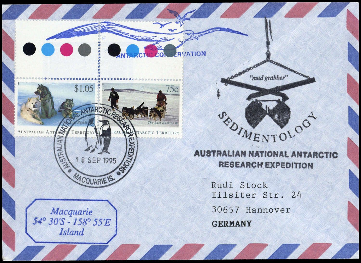 1994, 75 C und 1.05 D Schlittenhunde, Luftpostbrief mit Stations-K2 "MACQUAIRIE IS. A.N.A.R.E. 18 SEP 1995", 3 weitere Nebenstempel, Beförderungspuren nach Hannover